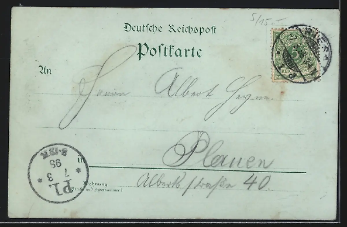 Personenbezogene Daten auf der Rückseite der Karte wurden durch blauen Textmarker unkenntlich gemacht. Die blauen Stellen sind auf die Vorderseite durchgeweicht und wirken sich negativ auf das Postkartenfoto aus
