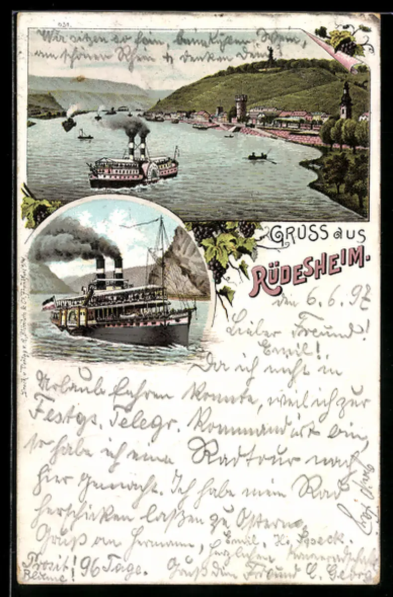 Lithographie Rüdesheim, Ortsansicht mit Rheindampfern