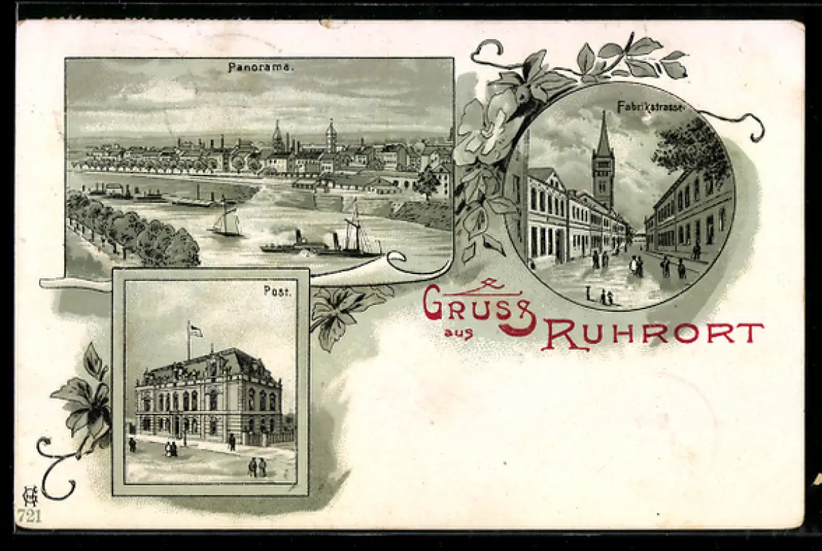 Lithographie Ruhrort, Panorama, Fabrikstrasse, Post