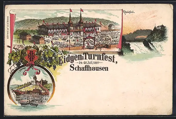 Lithographie Schaffhausen, Eidgen. Turnfest 1897, Rheinfall, Festplatz