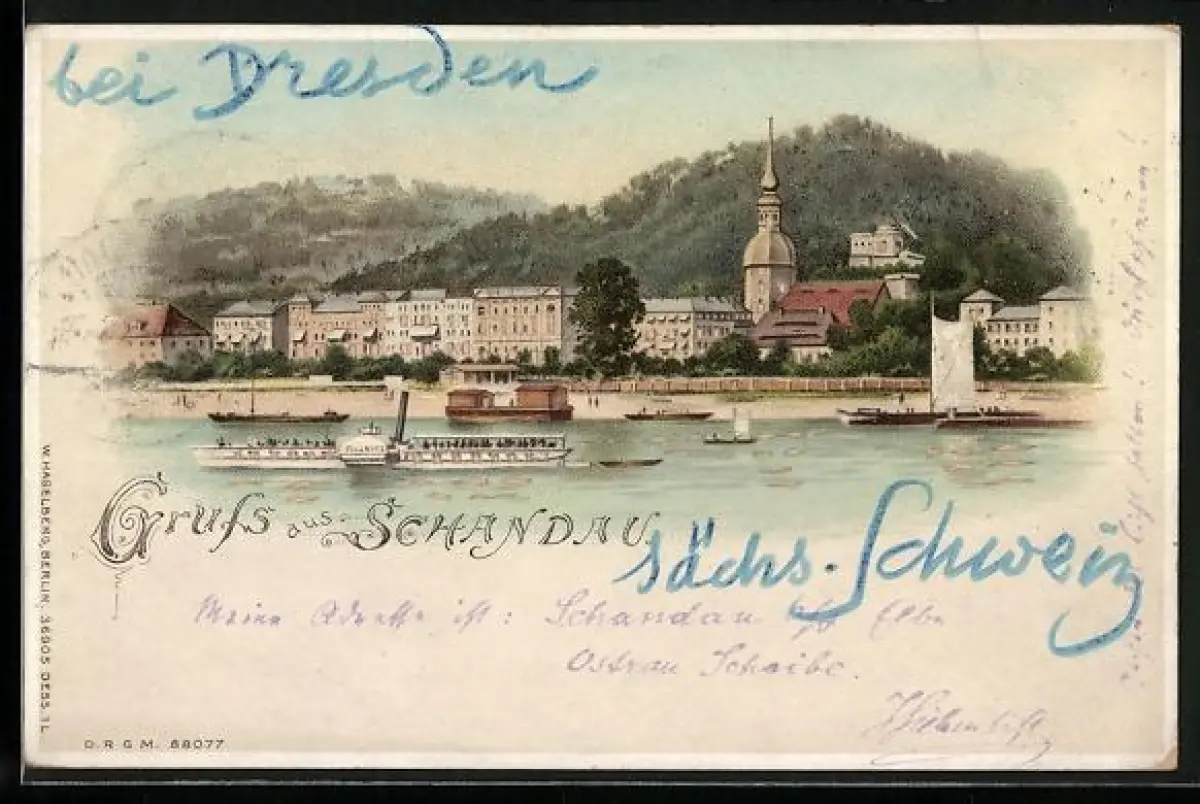 Lithographie Schandau, Uferpartie mit Kirche und Dampfer Pillnitz, Halt gegen das Licht