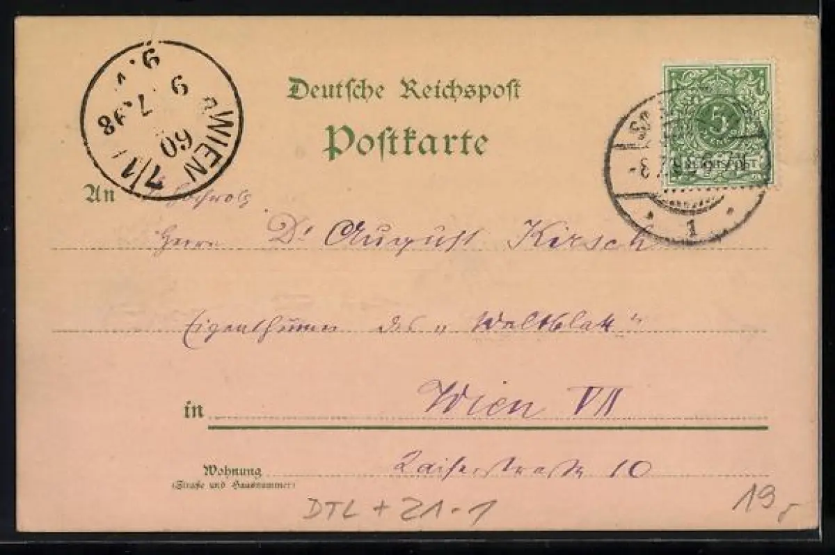 Personenbezogene Daten auf der Rückseite der Karte wurden durch blauen Textmarker unkenntlich gemacht. Die blauen Stellen sind auf die Vorderseite durchgeweicht und wirken sich negativ auf das Postkartenfoto aus