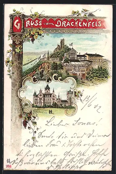 Lithographie Schloss Drachenburg, Burgruine auf dem Drachenfels mit Plateau