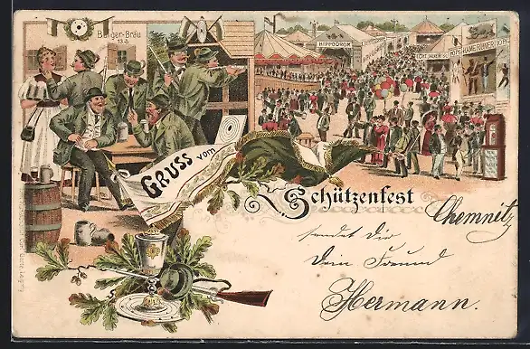 Lithographie Schützenfest, Bürger-Bräu mit Schützen, Alle auf dem Festplatz