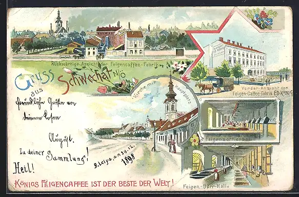Lithographie Schwechat, Feigencafe-Fabrik, Kirche mit Hauptplatz, Feigen-Dörr-Halle
