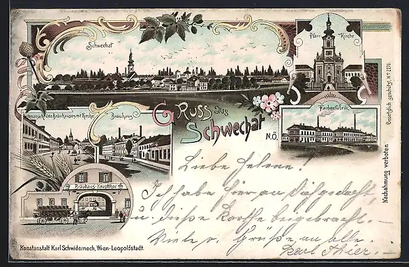 Lithographie Schwechat /N. Ö., Gasthof Bräuhaus, Seitenansicht mit Kirche, Haupttor