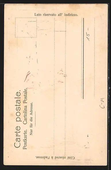 Personenbezogene Daten auf der Rückseite der Karte wurden durch blauen Textmarker unkenntlich gemacht. Die blauen Stellen sind auf die Vorderseite durchgeweicht und wirken sich negativ auf das Postkartenfoto aus