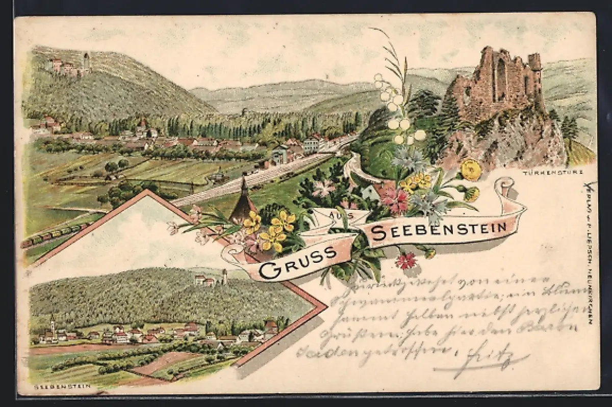 Lithographie Seebenstein, Ortsansicht mit Bahnhof und Türkensturz