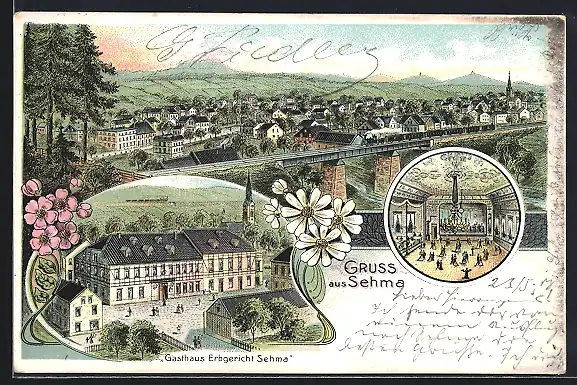 Lithographie Sehma, Gasthaus Erbgericht Sehma mit Innenansicht, Totalansicht aus der Vogelschau