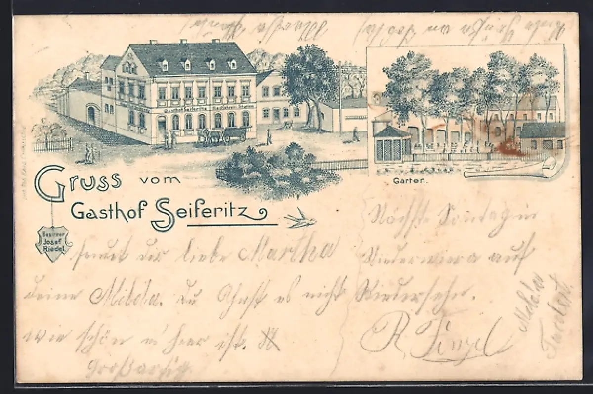 Lithographie Seiferitz, Gasthof Seiferitz, Bes. Josef Riedel, Garten