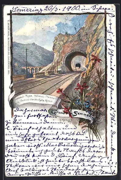 Lithographie Semmering, Kraasel Rippe, Potterus-Tunnel und Viaduct über die Kalte Rinne