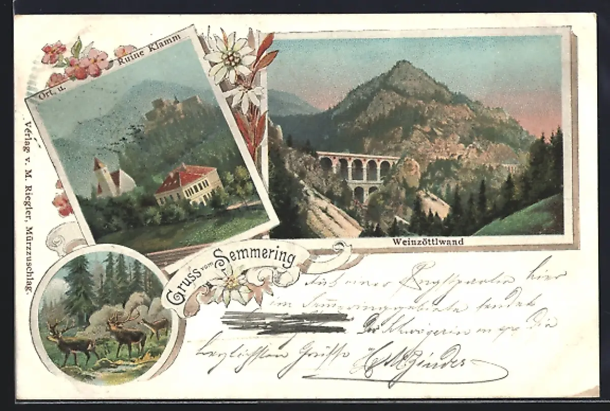 Lithographie Semmering, Ortsansicht und Ruine Klamm, Weinzöttlwand