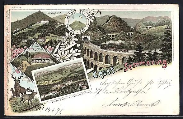 Lithographie Semmering, Südbahn-Hôtel, Touristen-Häuser am Wofsbergkogel, Meierei am Semmering