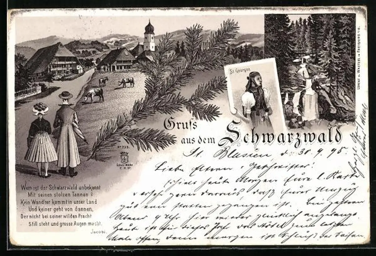 Lithographie St. Georgen / Schwarzwald, Gedicht, Ortspartie, elegantes Paar auf dem Spaziergang, Trachten