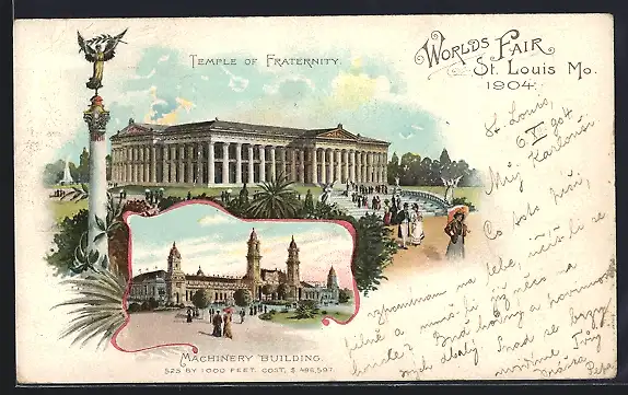 Lithographie St. Louis, Worlds Fair 1904, Temple of Fraternity, Machinery Building, Ausstellung