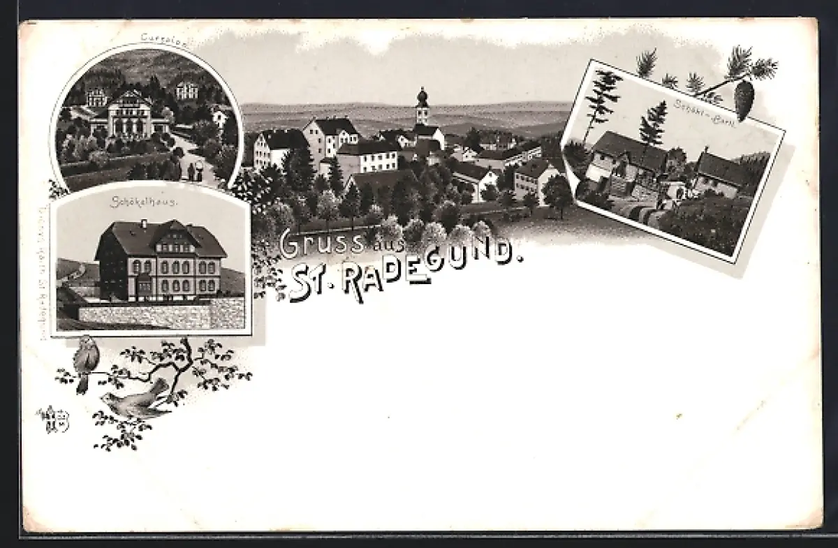 Lithographie St. Radegund am Schröckl, Gasthaus Schöckelhaus, Cursalon, Schöckl-Bartl., Ortsansicht aus der Vogelschau