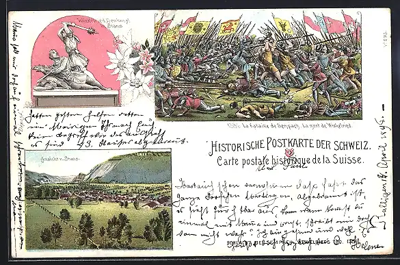 Lithographie Stans, Winkelried Denkmal, Ortsansicht, Schlacht von Sempach