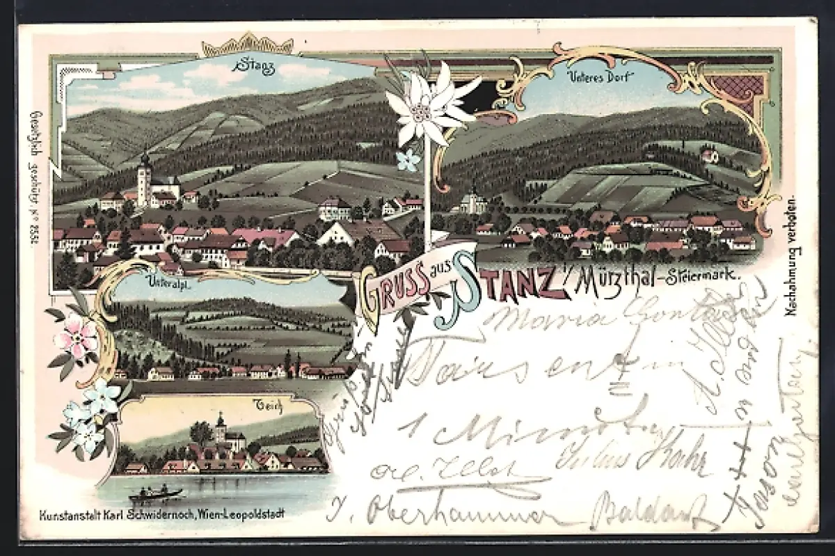 Lithographie Stanz i. Mürzthal, Teich, Unteralp und unteres Dorf