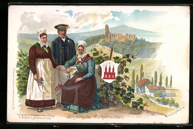 Lithographie Steinfeld, Unterfränkische Volkstrachten, Blick zur Ruine