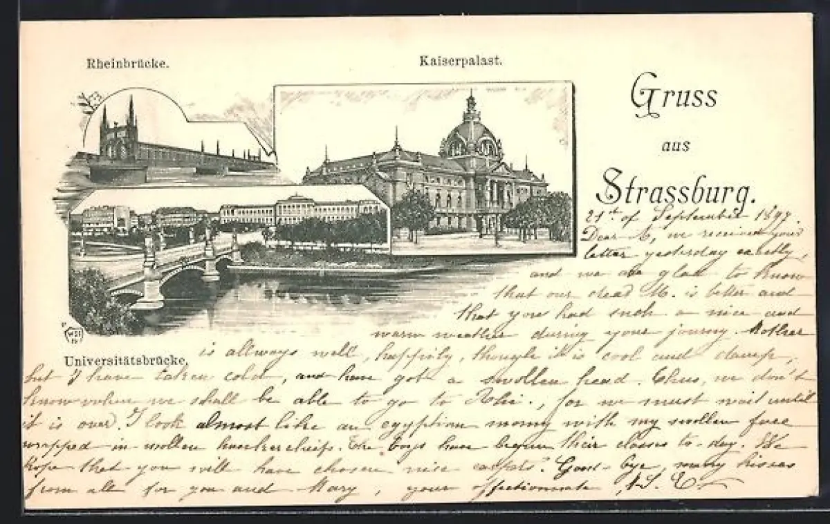 Lithographie Strassburg, Rheinbrücke und Kaiserpalast