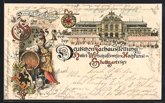 Lithographie Stuttgart, Deutsche Fachausstellung 1897, Festhalle und Bierfass