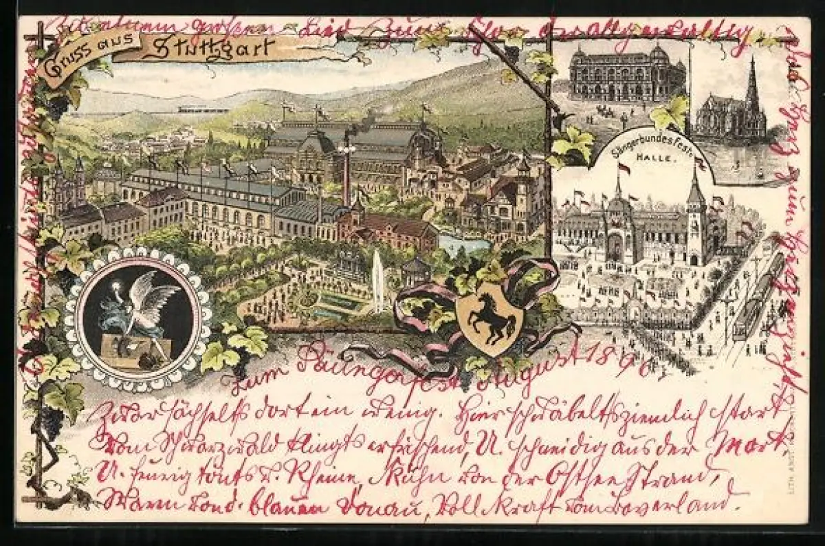 Lithographie Stuttgart, Kirche, Gebäudeansichten, Ortsansicht aus der Vogelschau