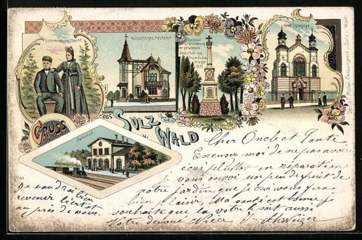 Lithographie Sulz u. Wald, Neue Synagoge, Kaiserliches Postamt, Bahnhof, Denkmal für die Gefallenen von 1870