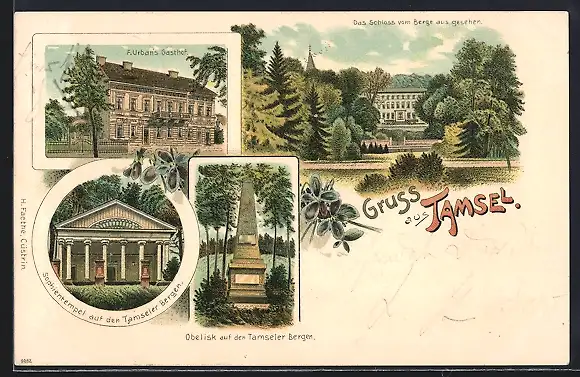 Lithographie Tamsel, F. Urbans Gasthof, Das Schloss, Obelisk