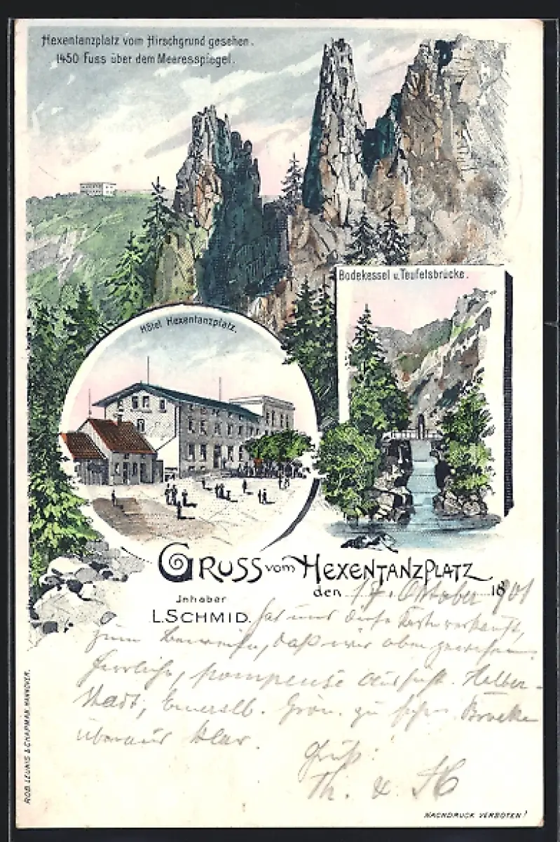 Lithographie Thale, Hotel Hexentanzplatz, Bodekessel & Teufelsbrücke