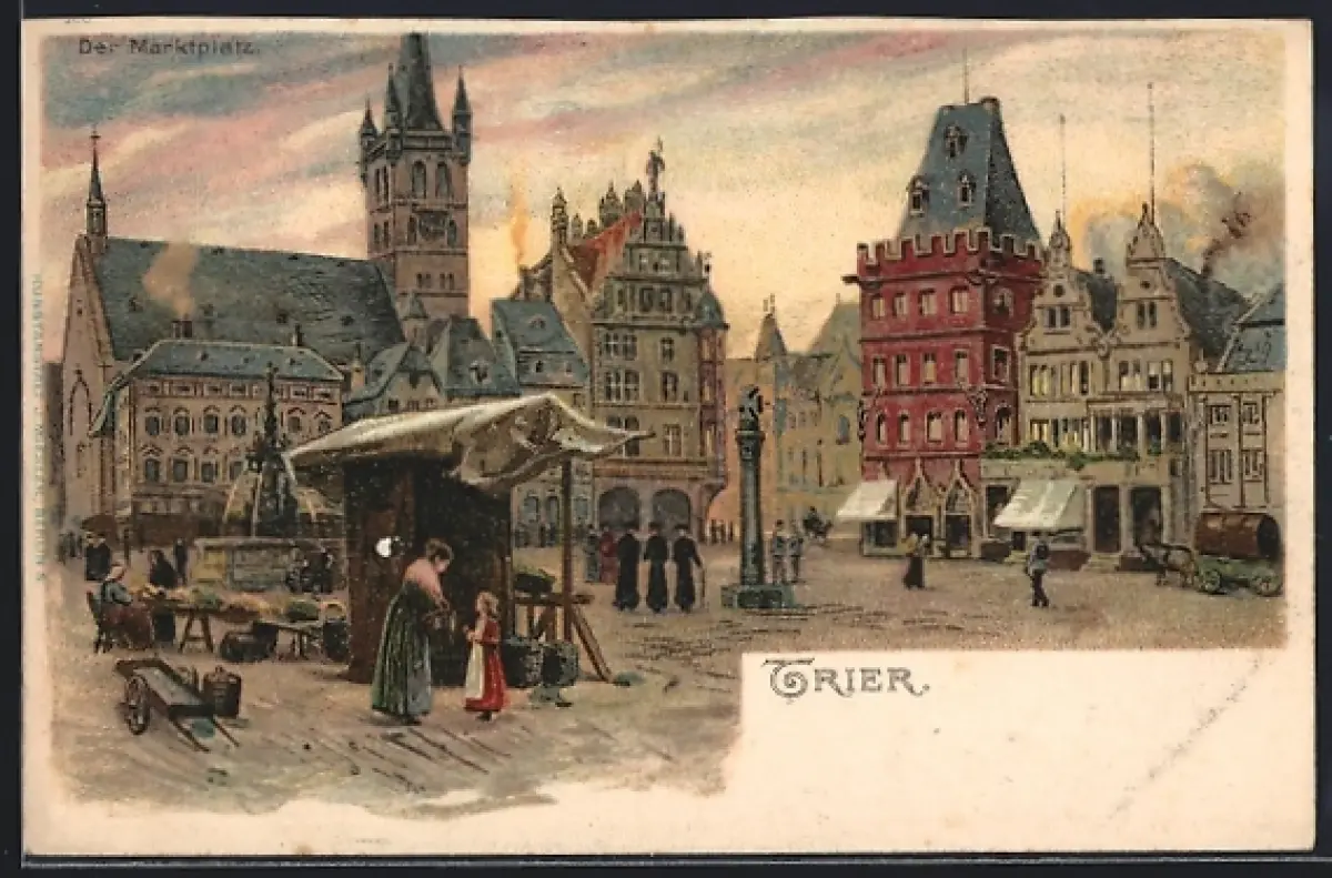 Lithographie Trier, Marktplatz mit Ständen, Brunnen und Denkmal