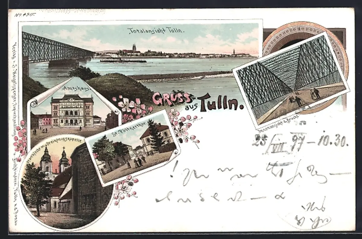 Lithographie Tulln, Amtshaus, Pfarrkirche mit Dreikönigskapelle, St. Pöltnerthor, Innenansicht der Brücke