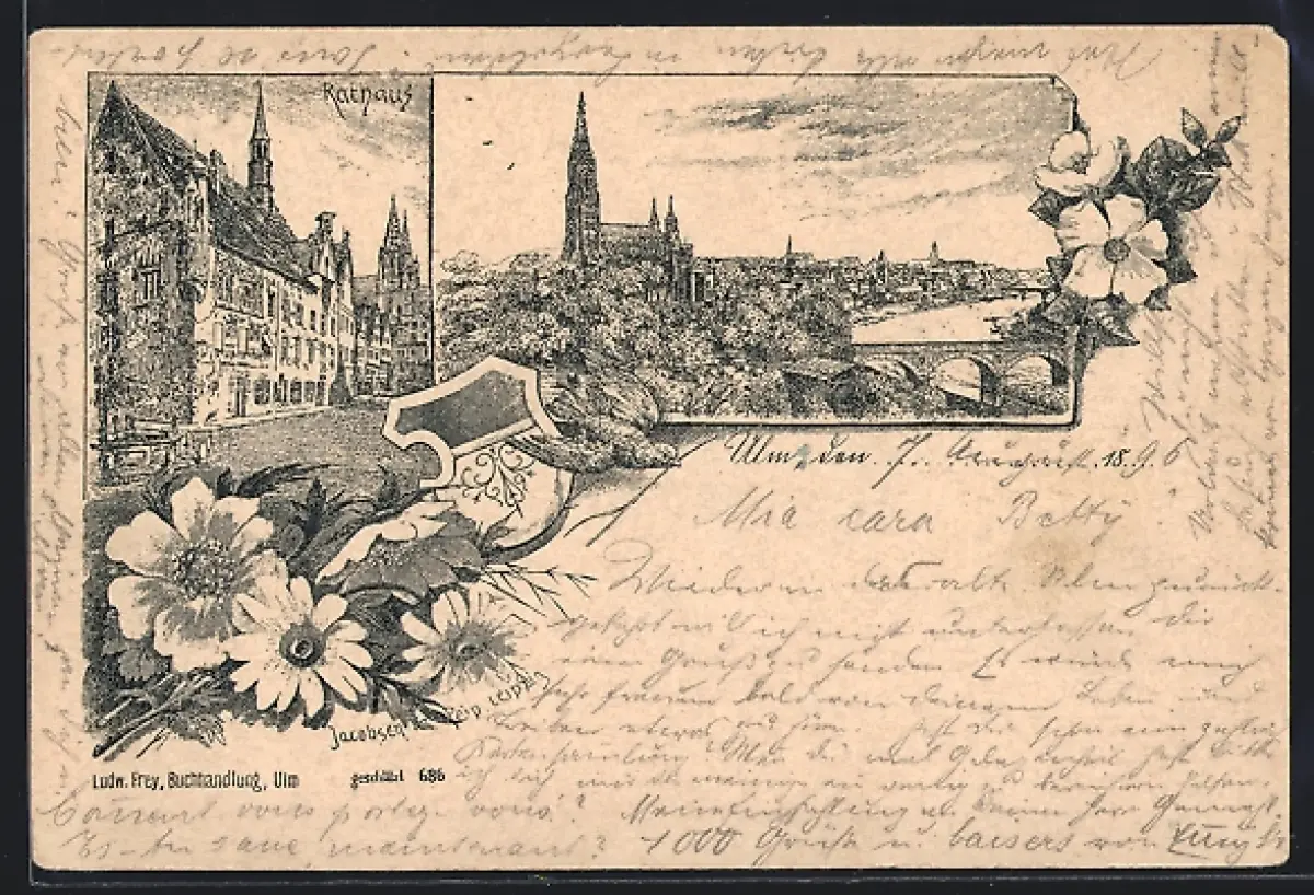 Lithographie Ulm / Donau, Rathaus, Flusspartie mit Brücke