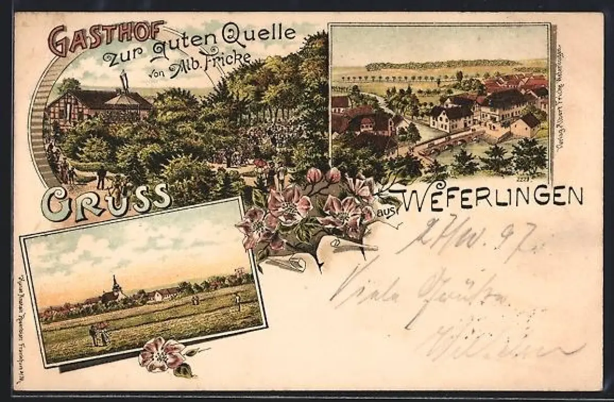 Lithographie Weferlingen, Gasthof zur guten Quelle von Alb. Fricke, Ortsansicht mit Kirche