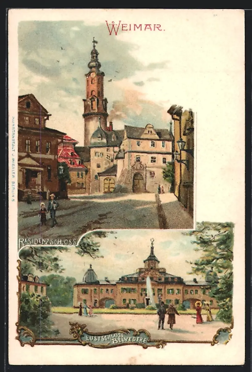 Lithographie Weimar / Thüringen, Residenzschloss, Lustschloss Belvedere