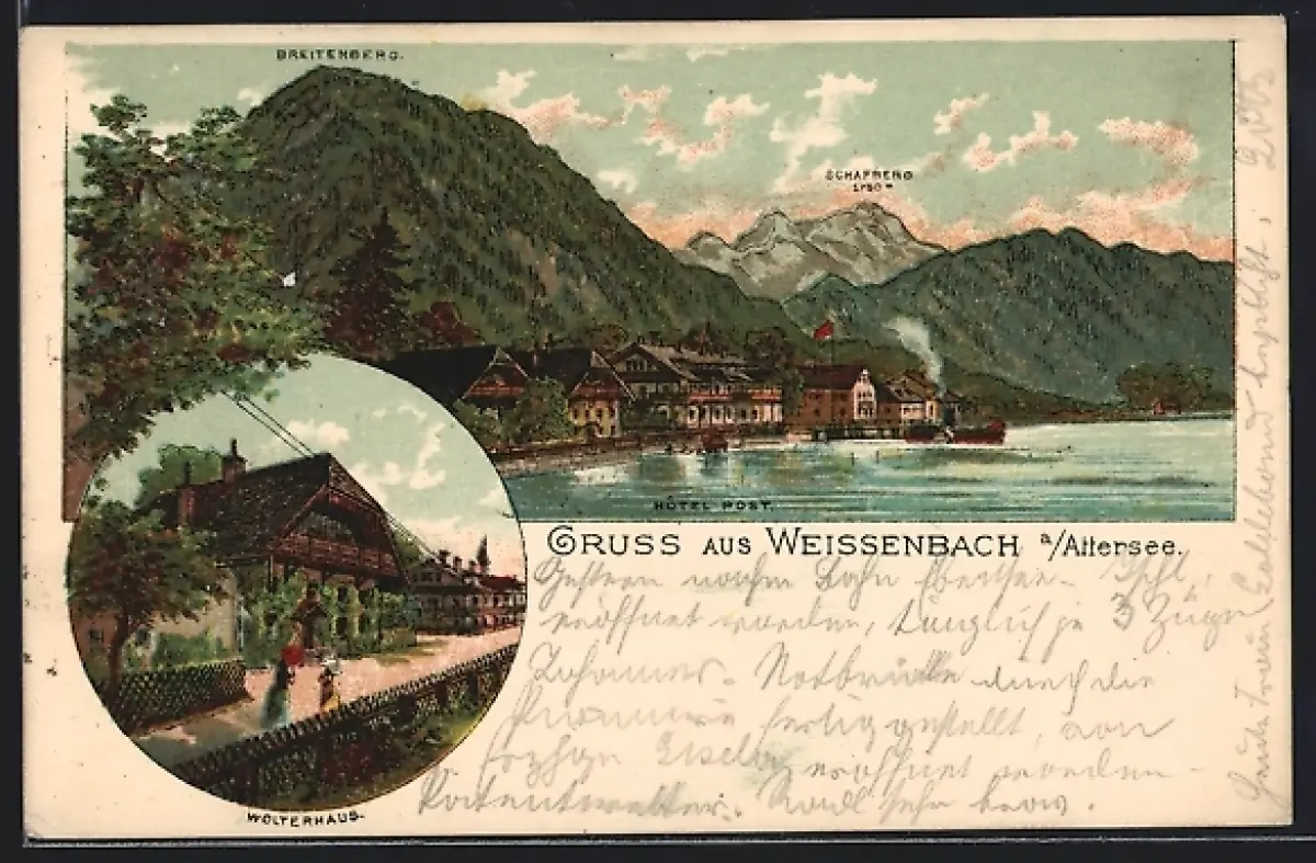 Lithographie Weissenbach a. Attersee, Hotel Post, Breitenberg, Schafsberg, Wolterhaus