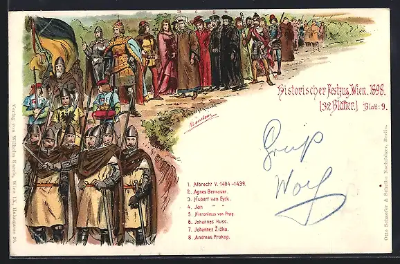 Lithographie Wien, Historischer Festzug 1898, Albrecht V. 1404-1439, Agnes Bernauer und Hubert van Eyck
