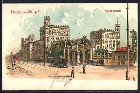 Lithographie Wien, Nordbahnhof mit Passanten, Pferdekutsche
