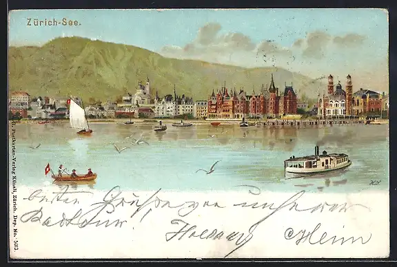 Lithographie Zürich, Ortsansicht, Zürich-See mit Uto, Berggesichter