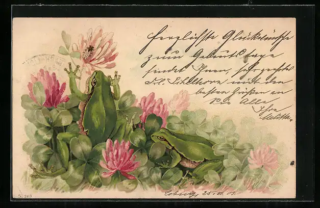 Lithographie Zwei Frösche mit Fliege im blühenden Klee