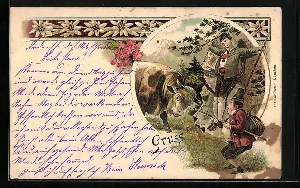 Lithographie Zwei Wanderer im Kampf mit einer Kuh, Karikatur, Edelweiss