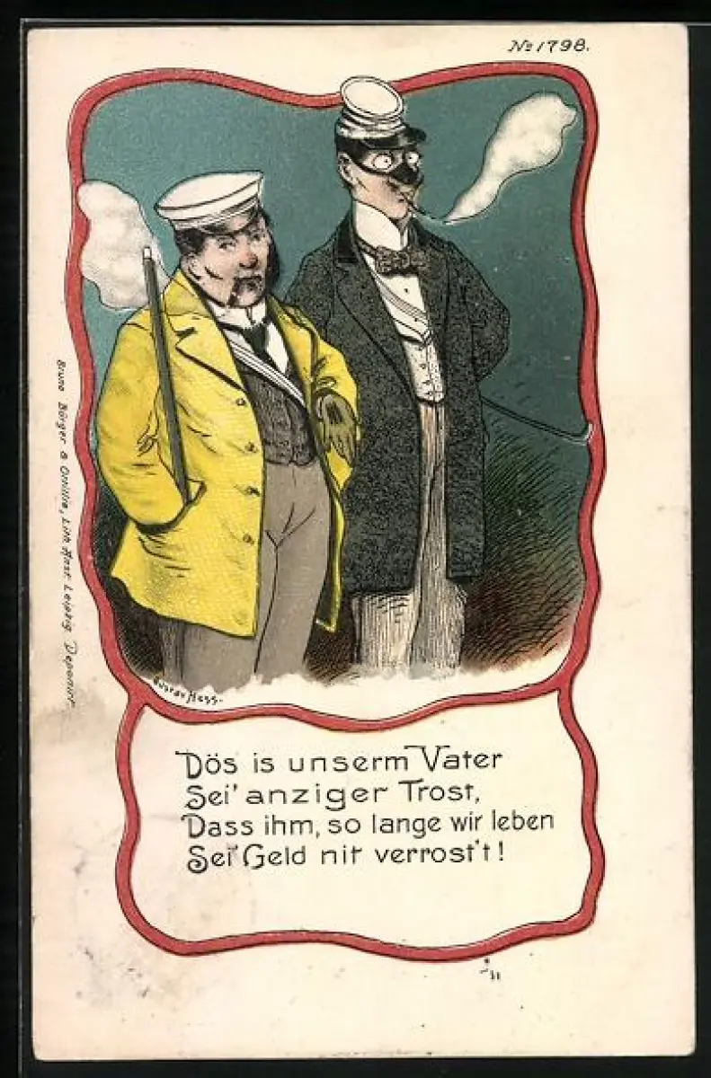 Lithographie Zwei rauchende Studenten, Dös is unserm Vater sei anziger Trost...