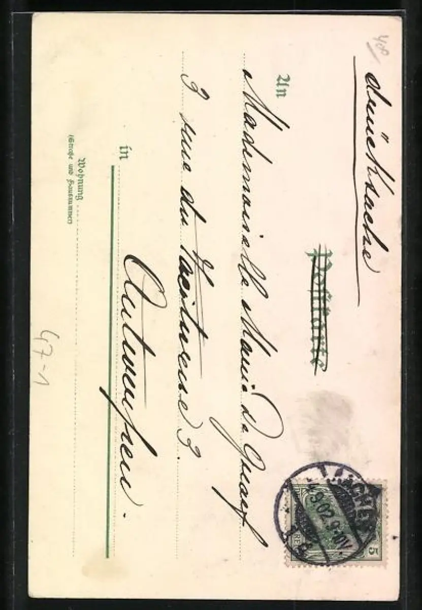 Personenbezogene Daten auf der Rückseite der Karte wurden durch blauen Textmarker unkenntlich gemacht. Die blauen Stellen sind auf die Vorderseite durchgeweicht und wirken sich negativ auf das Postkartenfoto aus