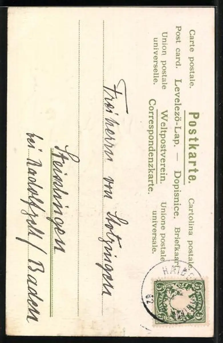 Personenbezogene Daten auf der Rückseite der Karte wurden durch blauen Textmarker unkenntlich gemacht. Die blauen Stellen sind auf die Vorderseite durchgeweicht und wirken sich negativ auf das Postkartenfoto aus