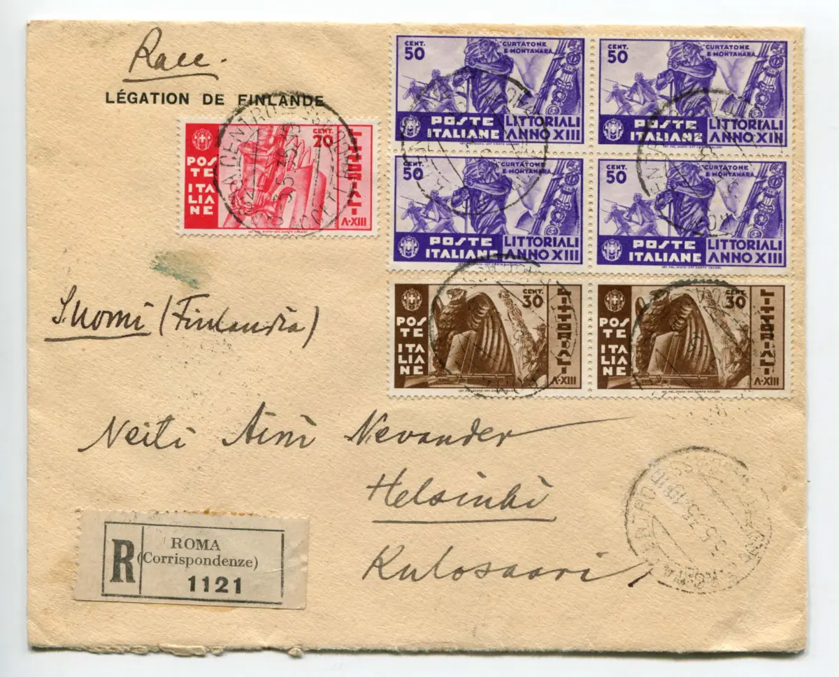 Littoriali + Viertel auf Umschlag Racc. für Helsinki - Littoriali Nr. 377 + 378 Paar + Nr. 379 Viertel auf Umschlag Racc. für Helsinki am 3.5.35 - Rückseite Pro Tuberkulose Briefverschluss - Schöne und ungewöhnliche Verwendung der kompletten Serie Code 60/7