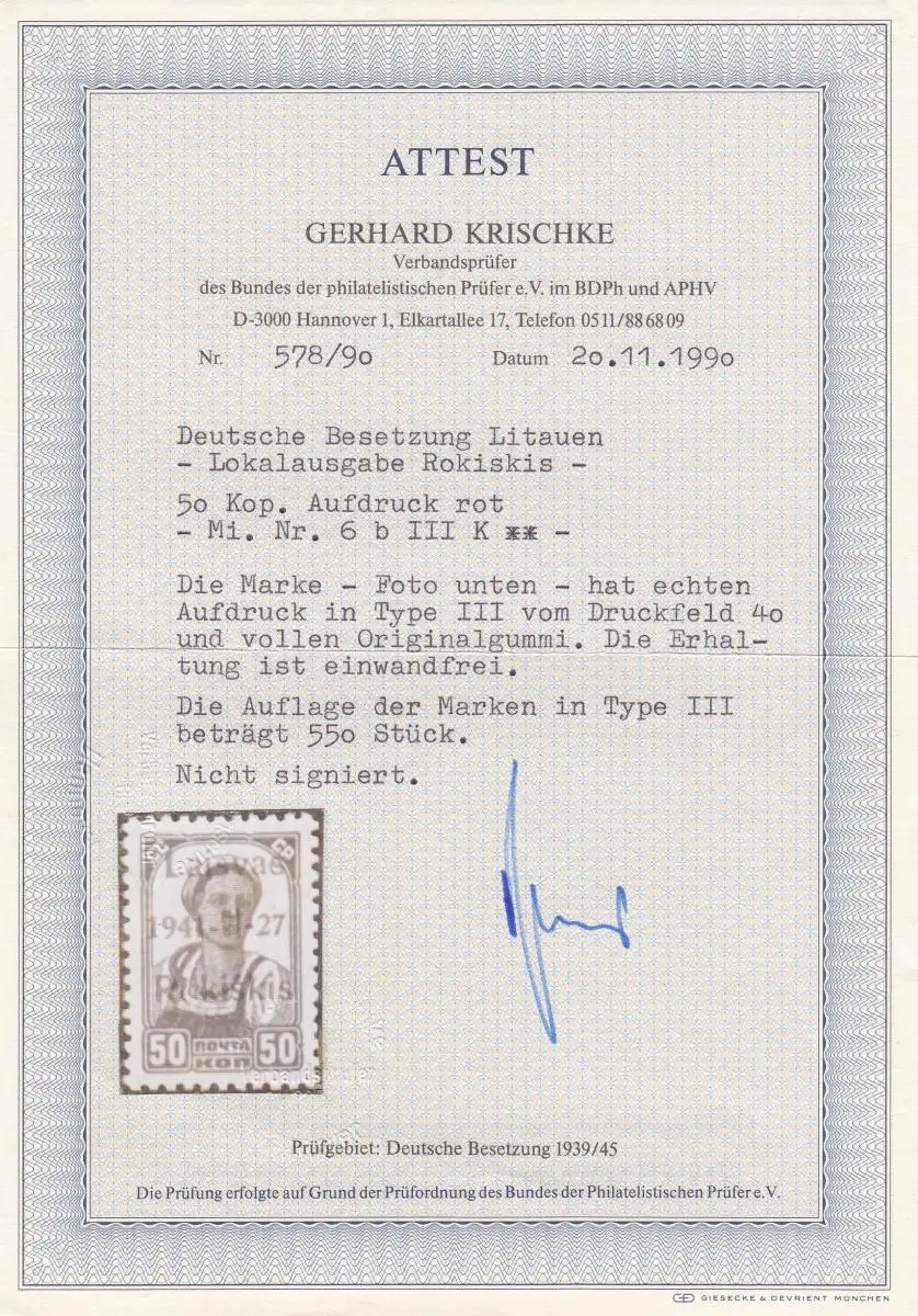 Lituanie: MiNr. 6b Impression Type III K, post-fraîchissement, BPP Attest