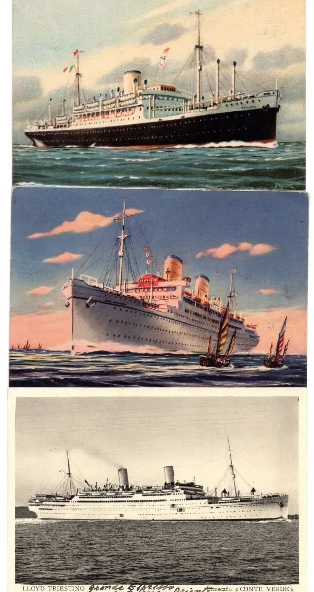 Lloyd Triestino - Lot von drei Schiffskarten - Lloyd Triestino - Lot von drei Postkarten für Schiffe Conte Verde, Conte Biancamano, Esperia und Toscana - guter Erhaltungszustand Code 138/3