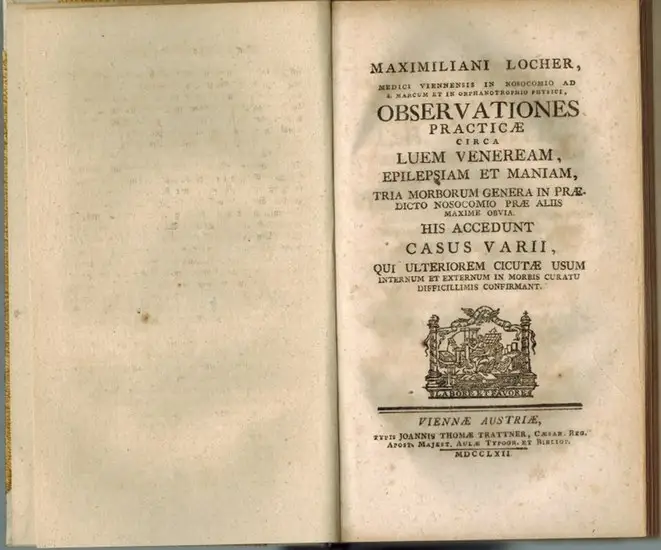 Locher, Maximilian: Maximiliani Locher Oberservationes Practicae circa Luem Veneream, Epilepsiam et Maniam, tria Morborum Genera in Praedicto nosocomio prae aliis maxime obvia. His accedunt casus varii, qui ulteriorem cicutae usum internum et externum in