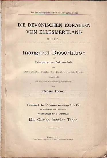 Loewe, Stephan: Die devonischen Korallen von Ellesmereland. Dissertation 1914. Mit Einleitung. Sonderabdruck aus Report of the second Norwegian Arctic Expedition in the 'Fram', 1898-1902, No. 30.
