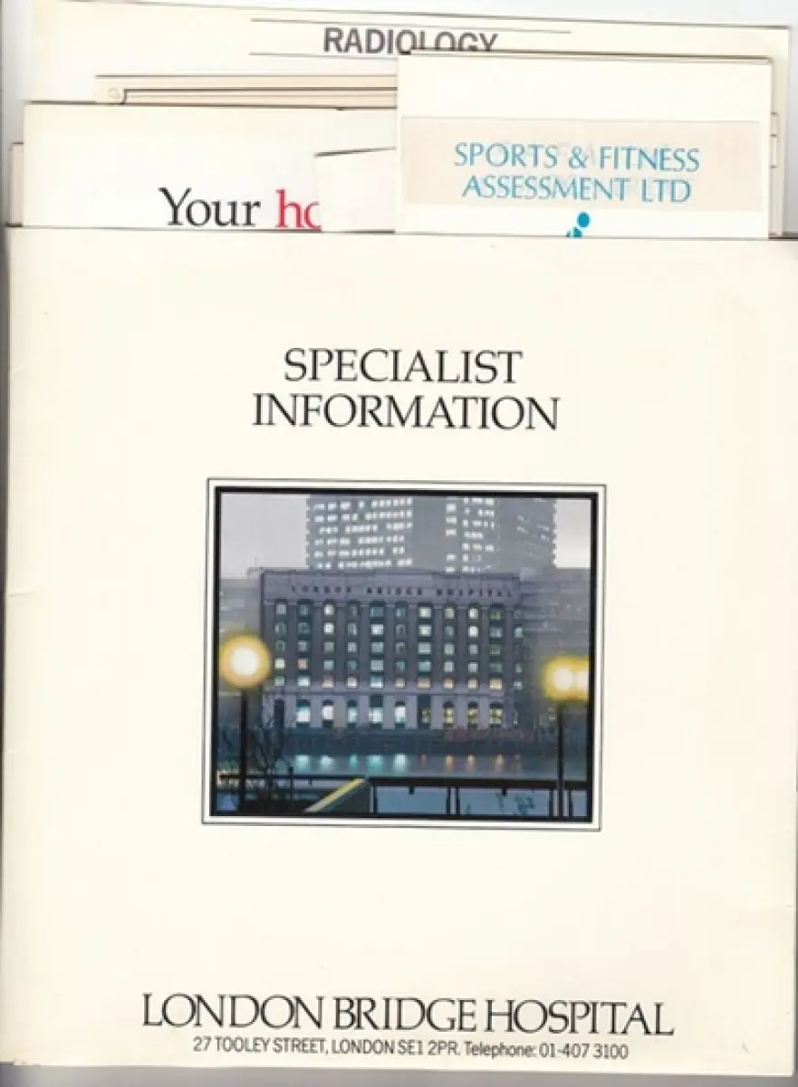 from the contents: Sports & Fitness Assessment Ltd (S.A.F-A.) / Personal screening / radiology information / StM St. Martins Hospitals Group / The London Bridge Dental Hygiene Centre / Cardiac catherisation / out-patient charges / schedule of charges / colposcopy.