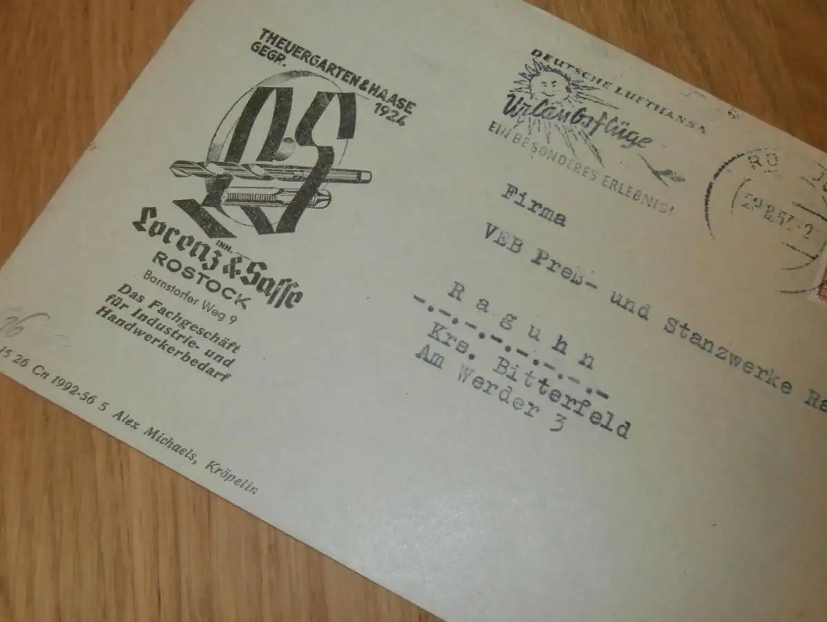 Lorenz & Sasse in Rostock i.M. , 1954 , Lufthansa - Stempel , alter Briefumschlag , Reklame , Mecklenburg !AZ-WR/1N